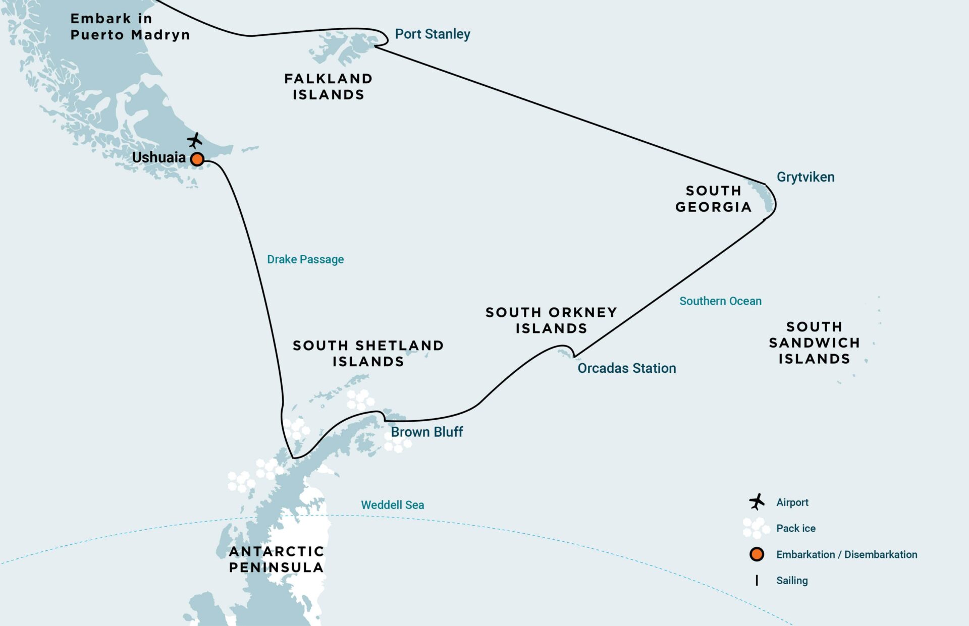 Jeśli warunki nie sprzyjają wejściu do Morza Weddella ze wschodu, statek skieruje się na Wyspę Słoni i do Cieśniny Bransfield, między Szetlandy Południowe a Półwysep Antarktyczny.